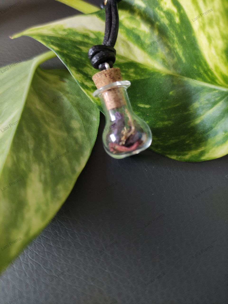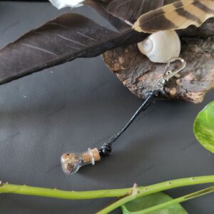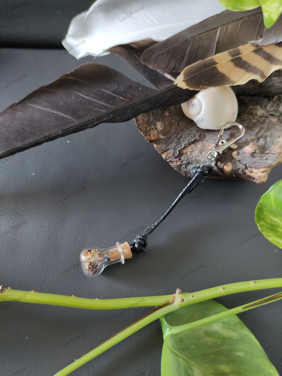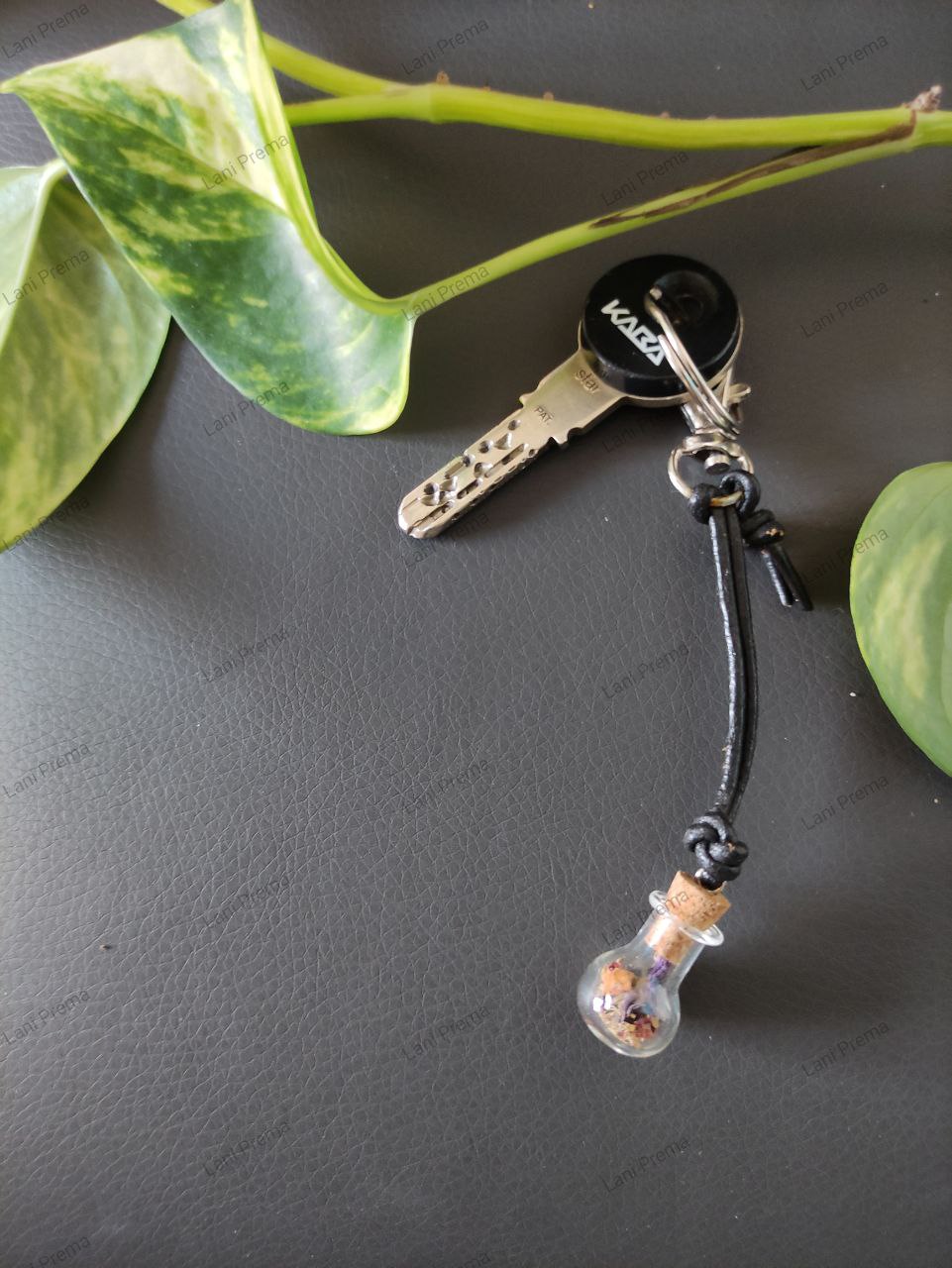 Material: Karabinerhaken, Lederband, Fläschchen mit Kork