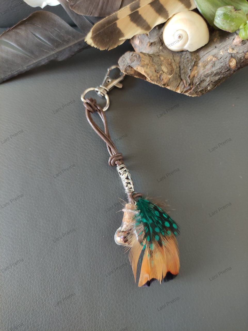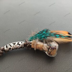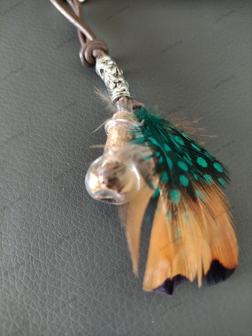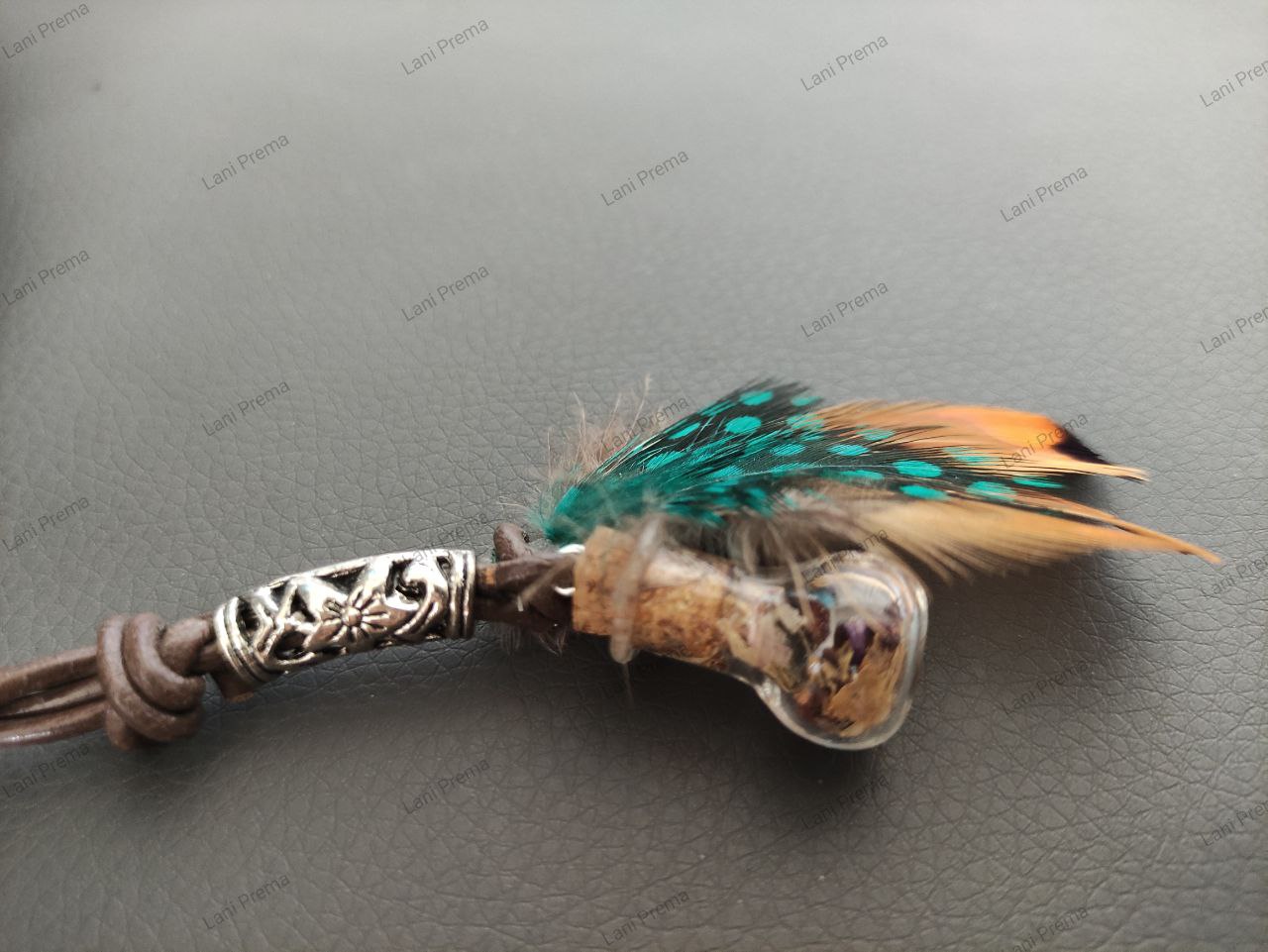 Material: Karabinerhaken, Lederband, Perle Silber mit Sternenblume, Fläschchen mit Kork, Federn mix.