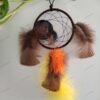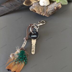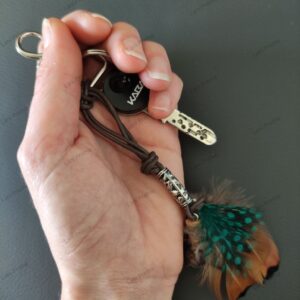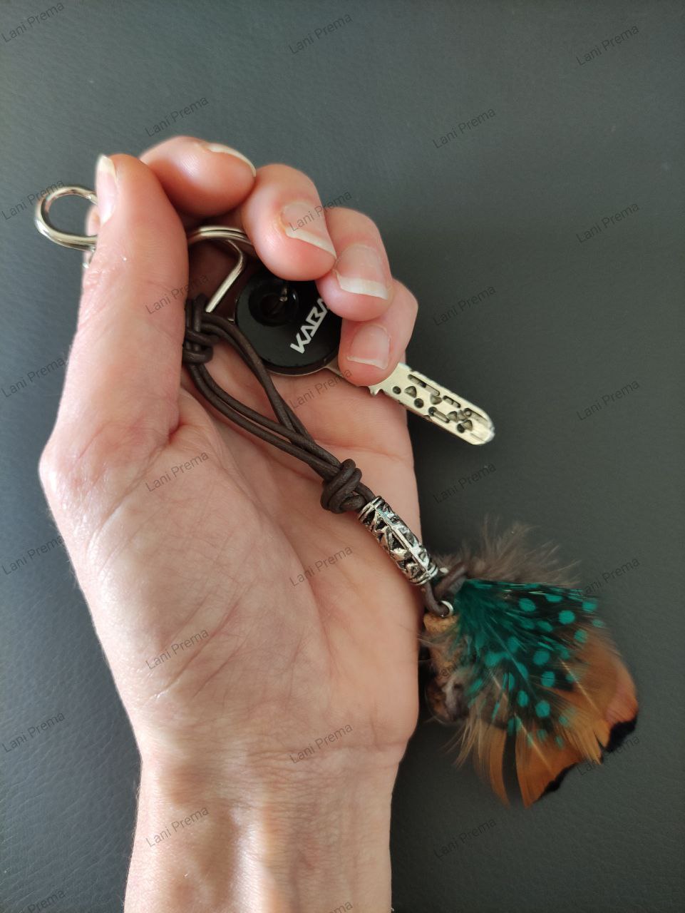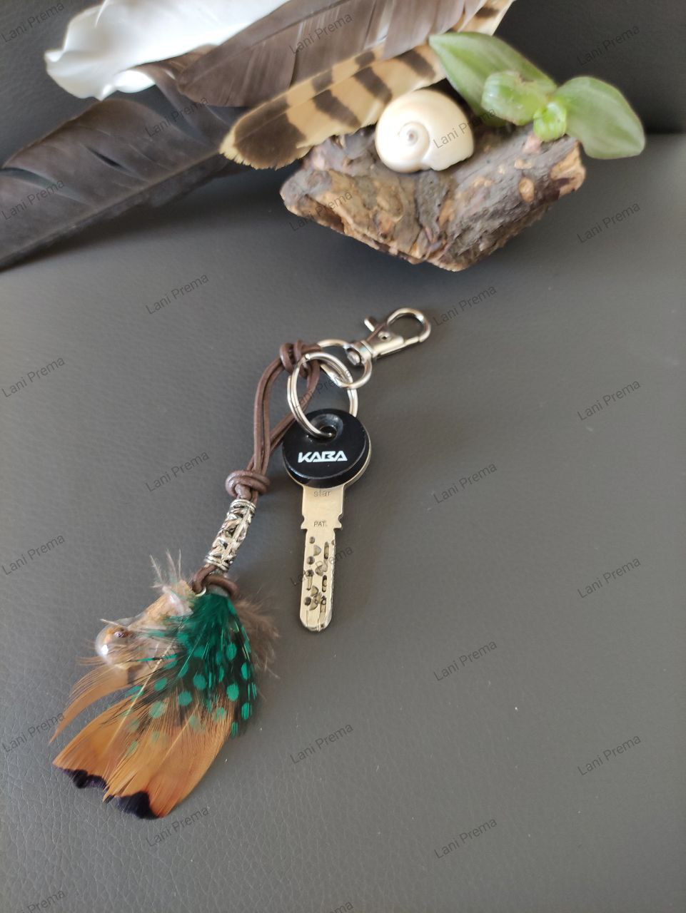 Material: Karabinerhaken, Lederband, Perle Silber mit Sternenblume, Fläschchen mit Kork, Federn mix.