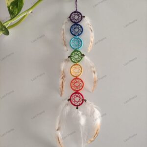 Der Chakra Traumfänger kann an einem Fenster, im Schlafzimmer, oder Meditationsraum platziert werden und wird in der Morgensonne bei offenem Fenster neutralisiert.